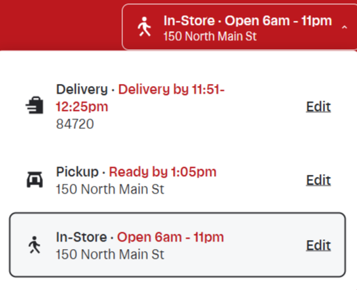 At the top of the website or App you can select: Pick Up, Delivery, or In-Store