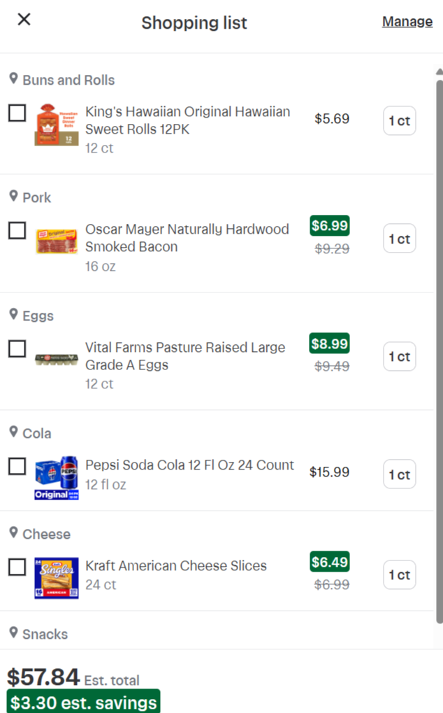 Department: If the product is not in an aisle, there will be an additional piece of information stating which Department it will be under. (Example: Dairy, Bakery, Deli, Produce, etc.)