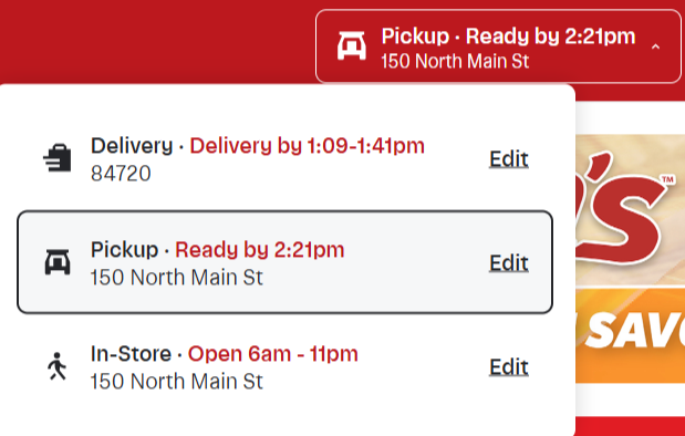 At the top of the website or App you can select: Pickup, Delivery, or In-Store