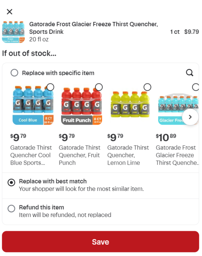 –Replace with a Specific Item: This is where you can choose what product to have the team replace if it cannot be found.